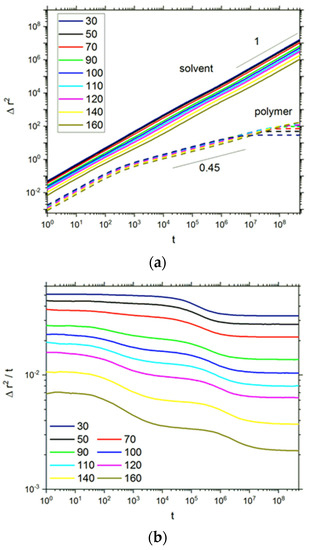 The long-time dynamic properties of soft matter systems can be studied by means of mean squared displacement (MSD) Δr2. The MSD of solvent molecules is defined as , where ri(t) are the coordinates of the ith bead at time t and N is the number of solvent molecules. In general, the dependency of the mean squared displacement on time can be written as Δr2 ~ tα. If the diffusion is normal, i.e., it follows the Einstein relation with the exponent α = 1, the case α < 1 corresponds to a subdiffusive (anomalous) motion that is expected in complex macromolecular systems [69]. Figure 5a presents the MSD as a function of time in a double logarithmic plot. It seems that the plots for all brushes studied exhibit a common scaling behavior t1 for solvent, but the closer examination of these curves reveals nonlinearity, at least for intermediate times. A more detailed discussion of polymer dynamics is presented later. The mean squared displacement divided by time as a function of time was plotted (Figure 5b) to reveal a deviation from Einstein law and the appearance of anomalous diffusion for solvent. Here the MSD function parallel to the time axis corresponds to the case of normal diffusion. Such regions where a normal diffusion is present are clearly observed for a very short time and the end of the trajectory. At intermediate times, a subdiffusive motion appears for brushes with both low and high DPn. Except for brushes with DPn = 30–70, the shape of curves is more complex, and this effect is discussed below. The density of polymer in the system is apparently above the static percolation threshold, at least for brushes with a higher degree of polymerization. Despite this, the motion of solvent is not limited at a longer time, which can be explained by the fact that the obstacles, i.e., polymer chains, are also mobile—it was shown that the percolation threshold is not observed for mobile obstacles [70,71]. Further insight into anomalous diffusion can be obtained from the analysis of the solvent mobility in a given layer, i.e., at a given distance from the grafting surface (the closer one). Of course, during the simulation, solvent molecules can change layers; therefore, these results can be treated only as a qualitative description of the influence of the local structure of the system on solvent motion. Figure 5c presents the mean square displacement calculated for the solvent molecules that were located, at the beginning of the simulation, on the surface (z = 2) and in the middle of the slit (z = 72). The results presented concern the degree of polymerization DPn = 110, i.e., the case where opposed brushes interact with each other. The difference in polymer density is approximately 2-fold for these cases (see Figure 1a,b). Solvent molecules that start to move in the layers close to the surface are considerably hindered by the presence of polymer chains, and their mobility is an order of magnitude lower than in the middle of the slit. Moreover, a well-defined transient subdiffusive region is observed, and it is the deviation from the normal diffusion that decreases with the distance from the grafting surface. These results are consistent with the molecular dynamics simulations of atomistic and coarse-grained model polymers in the slit [72,73].
