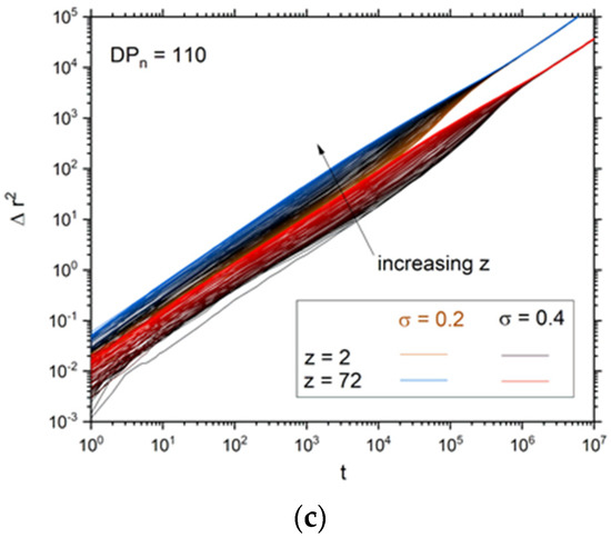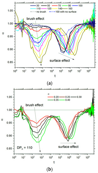 It is difficult to identify regions of anomalous diffusion using only MSD function because the changes in the exponent α are rather small. Therefore, the exponent α was calculated as a logarithmic derivative . Figure 6a presents the dependency of the exponent α on time for σ = 0.3. The deviations from the value α = 1 were found at a time between 101 and 104 (the first minimum) and for considerably longer times between 104 and 108 (the second minimum). The depth of the first one approaches the value 0.85 for the highest degree of polymerization and shifts slightly towards longer times with the increase in DPn. The same behavior was observed for the second minimum, although the changes in depth were smaller while the shift was considerably larger. To recognize the reason for the appearance of these two deviations from the normal diffusion, additional simulations were carried out: for an opposing polymer brush without grafting surfaces (the ends of chains were pinned and located at a virtual surface) and for a slit filled with solvent molecules but without polymer chains. The results of these additional simulations are included in Figure 6a. The exponent α calculated for a slit with solvent only does not exhibit the first minimum and does exhibit the second one. This behavior implies that the first minimum relates to the presence of an opposing polymer brush in the slit, while the second one is apparently caused by the presence of a pair of impenetrable surfaces. The confirmation of this statement can be found by analysis of the behavior of α for an analogous polymer system but without surfaces. Here the first minimum is observed (although the second one is also present but considerably shallowed—grafting sites are still present and immobile). Minima on the exponent α curves for polymer solutions without confining surfaces were also found for a time near 103 (these curves, however, were less complex) [74].