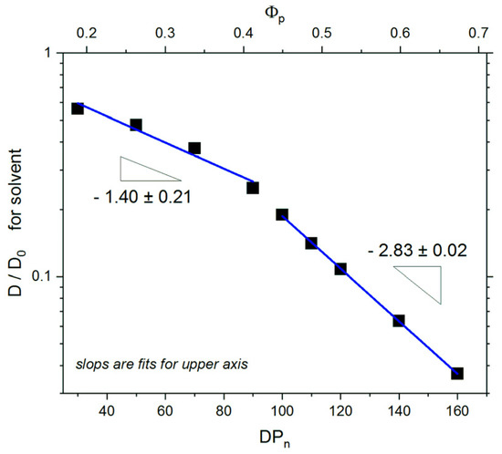 Long-timescale dynamics of the system is usually characterized by the self-diffusion coefficient D calculated from the mean squared displacement Δr2 as D = Δr2/6t. Values of the diffusion coefficient were determined in time windows where the diffusion was Fickian, i.e., where Δr2 ~ t1. Such regions of MSD were found for all systems under consideration at the longest times, i.e., at the ends of trajectories. Figure 7 presents the self-diffusion coefficient D/D0 as a function of the degree of polymerization, normalized by the value determined for a system containing molecules of solvent only with no polymer and no surfaces. One can easily identify two regimes of the self-diffusion coefficient scaling behavior. In both regimes, the ratio D/D0 decreases linearly: for a small degree of polymerization (DPn ≤ 90), where brushes are mostly separated, D/D0 ~ DPn−1.40. For compressed brush systems with a higher degree of polymerization, this dependency was found considerably stronger: D/D0 ~ DPn−2.83. One has to remember that the degree of polymerization is proportional to the polymer concentration according to the formula . Therefore, the dependence on the polymer concentration can be simultaneously studied.