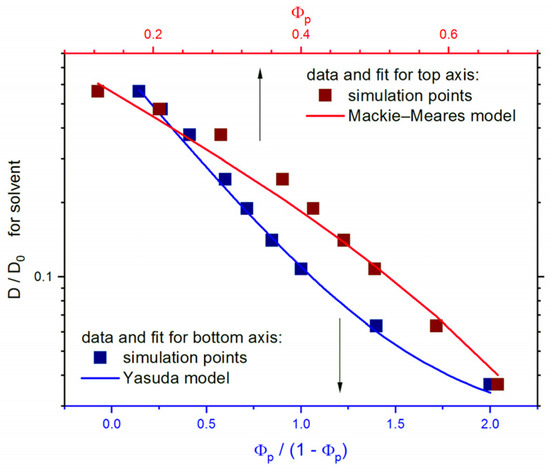 Solvent reduced self-diffusion coefficient D/D0 as a function of the polymer concentration Φp (top axis) and Φp /(1 − Φp) (bottom axis). The fits to Mackie–Meares and Yasuda theories are also marked. The case of σ = 0.3.