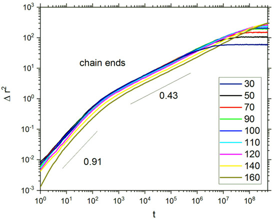 The dynamics of macromolecules in opposing polymer brush systems is also interesting as the motion of solvent molecules occurs in cooperation with polymer beads. The motion of the entire macromolecules is restricted due to their grafting, and therefore, the motion of chain ends, which are the most mobile, was studied. It should be noted that higher mobility of chain ends (when compared to inner polymer beads) was also found for free macromolecules in bulk [78,79]. It is shown that the upper part of the grafted chain relaxes an order of magnitude faster than the part close to the grafting point [42,43]. Figure 10 presents the mean squared displacement of chain ends as a function of time in a double logarithmic plot. Three different regimes can be distinguished for each degree of polymerization. In each regime, all chains exhibit the same scaling behavior regardless the degree of polymerization: the short time regime (below 102), where Δr2 ~ t0.91; the intermediate regime (between 102 and 106), where Δr2 ~ t0.43; and the long time regime, where Δr2 remains constant. The last regime corresponds to a limited motion, which is obvious as the chains are firmly anchored to the grafting surfaces. Using the same DLL model for a solution of polymer chains that can freely move (systems with varied chain lengths and concentrations but monodisperse), a different scaling was found: roughly Δr2 ~ t1 for short times (<102) and Δr2 ~ t0.3 (short chains) and t0.4 (long chains) for longer times (between 102 and 105) [54]. Recent Monte Carlo simulation studies of single brushes based on the bond fluctuation model and with the grafting density σ = 0.11 showed that the mean squared displacement scales with time like t0.5 (at longer time) and then flattens out [80].