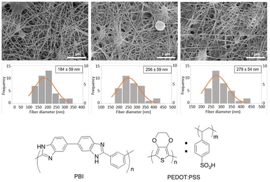 SEM images (top) and respective fiber diameter distributions (middle) of pristine electrospun PBI, cross-linked PEDOT:PSS-spin coated PBI and cross-linked PEDOT:PSS-dip coated PBI nanofibers. Scale bar: 7 μm. The discreet histogram values are represented on the left yy-axis and the normal probability density function each mean and standard deviation are represented on the right yy-axis. Chemical structures of poly [2,2′-m-(phenylene)-5,5′-bibenzimidazole] (PBI) and poly (3,4-ethylenedioxythiophene) doped with poly (styrene sulfonic acid) (PEDOT:PSS) are shown in the (bottom) panel.