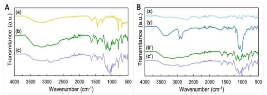 ATR-FTIR spectra of the various samples analyzed. (A) Spectra normalized to peak 799 cm−1 of (a) PBI electrospun fibers, and PEDOT:PSS/PBI obtained by (b) spin coating and (c) dip coating. (B) Spectra normalized to peak 2324 cm−1 of PEDOT:PSS/PBI samples obtained by (b’) spin coating and (c’) dip coating, (x) PEDOT:PSS pellet and (y) PEDOT:PSS pellet with GOPS.