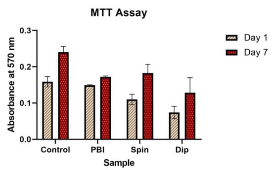 The viability and proliferation of hBM-MSCs on the three scaffolds prepared (pristine electrospun PBI fibers, cross-linked PEDOT:PSS-spin coated PBI fibers and cross-linked PEDOT:PSS-dip coated PBI fibers) were evaluated at days 1 and 7 by assessing cell metabolic activity using the MTT (3-(4,5-dimethylthiazol-2-yl)-2-5 diphenyl tetrazolium bromide, MTT Cell Growth Assay Kit, Sigma-Aldrich, St. Louis, MO, USA) assay following the manufacturer’s guidelines. Briefly, after washing the samples with PBS, the cells were incubated with MTT solution (1 mg·mL−1, prepared in PBS) and incubated for 4 h at 37 °C as previously described [29,30]. The resulting formazan salt was then dissolved using a solution of 0.1 M HCl in isopropanol under agitation for 5 min, and the absorbance values of the resultant solutions were measured using a plate reader (Infinite M200 PRO, TECAN, Switzerland) at 570 nm. Three scaffolds (n = 3) were used for each condition and the absorbance values were measured in triplicate. Acellular scaffolds (i.e., scaffolds that have not been seeded with cells) were used as blank controls.