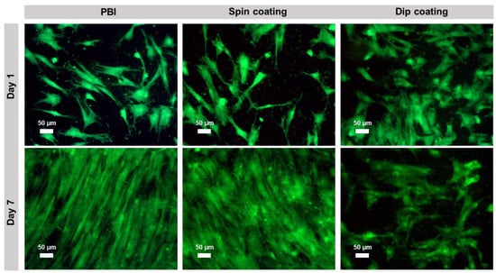hBM-MSCs’ viability and proliferation on the electrospun scaffolds were further confirmed through calcein staining at day 1 and day 7 (Figure 4). The results are in accordance with the MTT assay, as the cells showed high viability and were able to grow on all the tested samples. Particularly, on pristine PBI and cross-linked PEDOT:PSS-spin coated PBI electrospun scaffolds, cells proliferated until reaching almost confluence, whereas in the case of cross-linked PEDOT:PSS-dip coated scaffolds, a lower cell proliferation was observed, possibly due to its higher hydrophobicity (see Figure S2 in supplementary data). Accordingly, a study performed by Birhanu et al. demonstrated that adipose-derived MSCs presented a significantly lower proliferative capacity on hydrophobic poly (L-lactic acid) (PLLA) nanofibers in comparison to plasma-treated hydrophilic PLLA scaffolds [56].