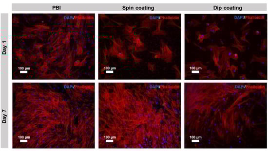 DAPI/Phalloidin immunofluorescence staining of hBM-MSCs cultured on pristine electrospun PBI, PEDOT:PSS-spin coated PBI fibers and PEDOT:PSS-dip coated PBI fibers for days 1 and 7. DAPI stains cell nuclei blue, while Phalloidin stains actin-rich cytoskeleton red. Scale bar: 100 μm.