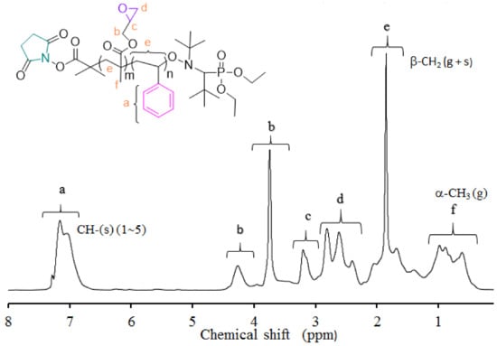 Figure 3 shows a representative 1HNMR spectrum of P(S-co-GMA) copolymers and assignments of their resonances. Chemical shifts from phenyl protons in the region of 6.6–7.3 ppm, methylene oxy (–OCH2–) protons in the region 3.5–4.5, and methyl protons of GMA units in the region 0.5–1.2 ppm are observed. Copolymer composition was determined from 1H-NMR characteristic resonances, applying previously reported equations [55]. The synthesized P(S-co-GMA) copolymers contained approximately 41–59 mol% GMA.
