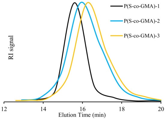 As observed in Figure 4, narrow and monomodal GPC traces were obtained in all the conversion range for the P(S-co-GMA) copolymer samples. It is observed in Table 2 that our NMP-synthesized copolymers presented number average molar masses in the range of 27,000–28,400 g mol−1, which is in good agreement with w Mn,th = 30,000 g mol−1, at about 90% conversion. The obtained results suggest that no side reactions occurred during the copolymerization and that it is well-controlled, regarding molar mass development [56,57]. The synthesized P(S-co-GMA) copolymers displayed narrow Ð values, which ranged from 1.22 in the case of 35% GMA, to 1.29 when GMA content is 55%. Ð was somewhat higher for the copolymers richer in GMA, showing that it is more difficult to control the reaction, as GMA content is increased [58].