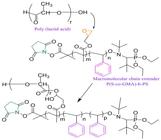 The proposed chain extension mechanism of PLA with P(S-co-GMA)-b-PS, which involves the reaction between glycidyl groups present in P(S-co-GMA)-b-PS copolymers and PLA carboxyl groups, is shown in Figure 5. According to the literature, the epoxy functional groups from GMA present in P(S-co-GMA)-b-PS can react preferentially with both hydroxyl and carboxyl functional groups present in the biopolymer. However, the reaction with epoxide is more favorable in the case of carboxyl groups [59], resulting in the opening of the epoxy-ring and the creation of new covalent bonds [59,60]. Indeed, the epoxide functionality allows the formation of covalent bonds with the nucleophilic end groups present in the biopolymer. The strong polarization of the hydroxyl group of carboxylic acids ensures fast reactions with epoxy/carboxyl groups, but under suitable conditions the epoxide ring may also react with the weaker hydroxyl nucleophile functionality [61].