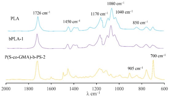 The Fourier transform infrared spectroscopy (FTIR) spectra of P(S-co-GMA)-b-PS, PLA and bPLA-1 are shown in Figure 6. Several characteristic bands of PLA are observed in the FTIR spectrum of PLA are observed in that figure: The carbonyl group (C= O) stretching vibration appears at 1726 cm−1, the C−H deformation vibration band at 1450 cm−1, the methyl characteristic band at 1370 cm−1. It is also possible to observe the C−O asymmetric stretching band at 1170 cm−1 and the C−O−C symmetric band at 1080 cm−1. Moreover, in Figure 6 for the FTIR spectrum of P(S-co-GMA)-b-PS, we observed the characteristic bands of the styrene function at 800–600 cm−1, and a clear band at 905 cm−1, corresponding to the stretching vibration of the epoxy ring.
