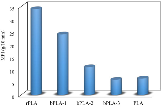 The use of chain extenders decreases MFR, which indicates recovery (increase) of the polymer molar mass. For example, MFR for sample modified bPLA–1 was 24 g/10 min. The best results are obtained when using chain extenders P(S-co-GMA)-b-PS–2, and P(S-co-GMA)-b-PS–3, which correspond to GMA concentrations of 35 and 46, rendering 11 and 6 g/10 min, respectively. This clearly indicates a difference in melt flow behavior between unmodified and chain extended rPLA, which can be attributed to the increased molar mass [62].