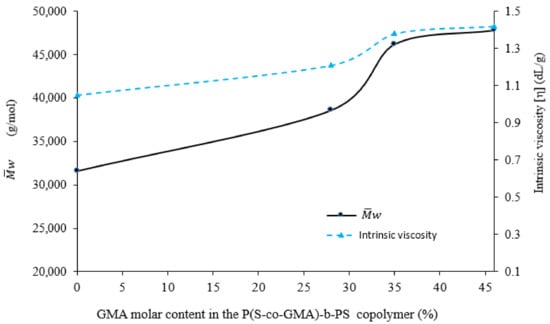 The incorporation of P(S-co-GMA)-b-PS copolymers into the reacting mass results in an increase in rPLA intrinsic viscosity, due to chain extension, which is proportional to GMA concentration. As shown in Figure 8, GMA concentrations between 0 and 28 wt.% in the chain extender copolymers lead to steep increases in both [η] and . At these GMA concentrations, the effect is small. Although the chain extension reaction minimizes the effect of degradation, it does not overcome it completely.