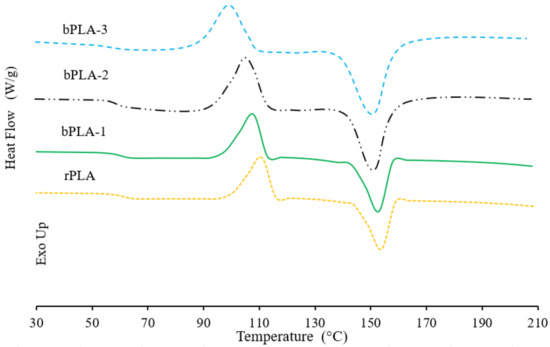 The effects of the chain extension process on the melting and crystallization characteristics of rPLA are shown in Figure 9. During the heating scan, DSC thermograms for rPLA and bPLA show a glass transition (Tg) around 60 °C. It is observed that the values of Tg for rPLA and modified PLA differ negligibly (see also Table 3). An endothermic peak corresponding to the melting of the rPLA crystalline structures is observed at around 150 °C [64]. It is also observed in Figure 9 that this peak decreases slightly when rPLA and bPLA samples are compared, showing that the P(S-co-GMA)-b-PS chain extender may lead to the formation of imperfect crystalline structures. Finally, an exothermic peak which corresponds to the cold crystallization of rPLA is observed at around 110 °C during the heating scan.