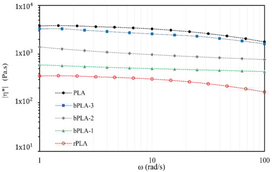 Rheological properties are important to assess biopolymer performance during melt processing. Experimental profiles of complex viscosity (ƞ*) versus angular frecuency (ω) for PLA, rPLA and bPLA blends with different levels of GMA are shown in Figure 10. It is observed that PLA follows a Newtonian behavior in the low-frequency region (<10 rad∙s−1) and shear thinning beyond 10 rad∙s−1, highlighted by a decrease of the complex viscosity modulus. A large decrease in viscosity for rPLA, from 3700 to 354 Pa∙s, caused by polymer degradation, is clearly observed in Figure 10.
