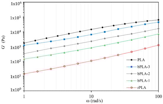 Storage modules G’ vs. frequency for r-PLA and bPLA blends.