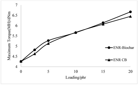 Rubber composites have been investigated using renewable, nonpetroleum-based filler sources such as kenaf [1], chitosan [2], starch [3,4,5], soy proteins [6], and other fibre [7,8,9,10,11]. Even though some of these materials have shown potential reinforcing capabilities, the industry appears hesitant to experiment with filler materials that are fundamentally different from carbon black (CB) in terms of appearance and source. Global demand for petroleum products is increasing, making it vital to investigate renewable, alternative fuels and other materials to replace them if global petroleum resources run out. Carbon black is a petroleum product that dominates the rubber composite filler market due to its low cost [12]. Because of its outstanding reinforcing characteristics, low cost, and ability to be supplied in a highly pure and wide range of agglomerate sizes, carbon black, a petroleum product, has long been the standard filler for rubber composites (with the main market being the tyre industry) [13]. Biochar has recently been considered a possible replacement for carbon black additives in polymeric composites [14,15,16]. The coffee industry globally produced enormous coffee residues from manufacturing coffee beverages and instant coffee preparation, with global output estimated at 168.87 million bags (1 bag = 60 kg) in 2018–2019 [17]. Instead of being thrown away, the coffee residues could be utilized for a variety of purposes. New ideas on exploiting this residue and other renewable resources should be welcomed as a step toward a more sustainable future. Biochar is a renewable, non-petroleum-based filler substance that resembles CB in appearance. Biochar is carbon-containing charcoal generated by pyrolysis (thermal treatment in an oxygen-free atmosphere) from various carbon-containing biomass feedstocks, including hardwoods, crop residues, and poultry litter [18]. We have recently looked at using biochar as a filler in rubber composites [19,20,21,22]. ENR is a derivative of natural rubber which has two reactive sites that are unsaturated isoprene and epoxidized isoprene units. Biocomposites with good biodegradable properties can be derived from further modification of ENR [23,24,25,26].