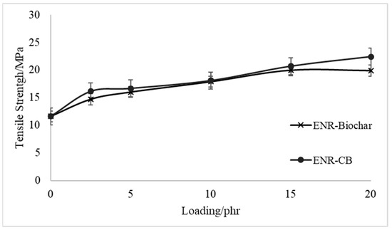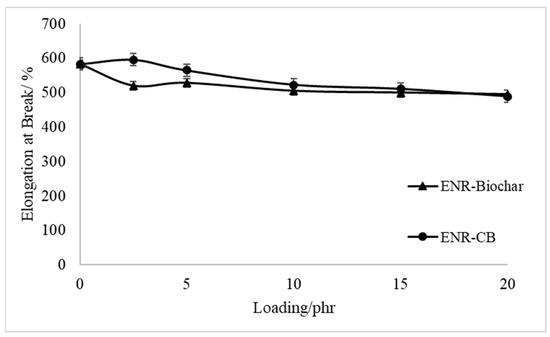 Figure 4 and Figure 5 show the tensile strength curves and elongation at the break of EBR-Biochar and ENR-CB under various loading conditions. The tensile strength properties of the biochar-filled ENR, as shown in Figure 4, increased initially and reached an optimal value when the content was at 10 phr before decreasing as the biochar loading increased. Figure 4 shows that the composites can match the tensile strength of carbon black when loaded with 10 phr of biochar. Even at 15 phr loading, the differential between biochar and CB is minimal at around 3%. This behavior could possibly be due to the chemical interactions and hydrogen bonding between the hydroxyl and epoxide groups in ENR molecules. This property creates the potential to be commercially viable for applications that need a rubbery substance. At that concentration, composites manufactured with the SC biochar fillers would be stronger and more flexible than those made with carbon black. The reinforcing impact of the fine biochar and an increase in the crosslinking density of the films might explain the first rise in tensile strength with increased biochar loading. The aggregation of biochar, which generally includes internal voids capable of absorbing polymer and partially sheltering it from stress when the rubber matrix is deformed, might explain the decrease in tensile strength seen with large biochar loadings [29]. The ENR-CB films’ tensile strength revealed that CB’s reinforcing impact was superior to the other fillers. Due to the high activity of CB and its oxidized surface, which increased with increasing degree of crosslinking of the fillers–elastomers, the improvement in tensile strength after the addition of CB lasted across the entire range studied [30]. They hypothesized that chemical and physical linkages (weak hydrogen bonds and Van der Waals forces) formed between the rubber’s carboxylic and reactive groups on the filler surfaces. However, in the epoxidized natural rubber matrix, the combination of biochar and CB decreased the elongation at break, as seen in Figure 5. The reduction is due to a significant interaction between fillers and rubber molecules, which reduced rubber vulcanizate mobility even further. Beyond 10phr loading, however, the elongation of biochar is similar to that of carbon black.