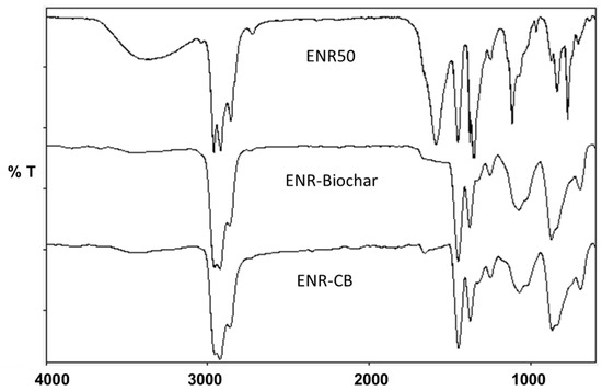 FTIR spectra of ENR 50, ENR-Biochar, ENR-CB at 10phr loading.