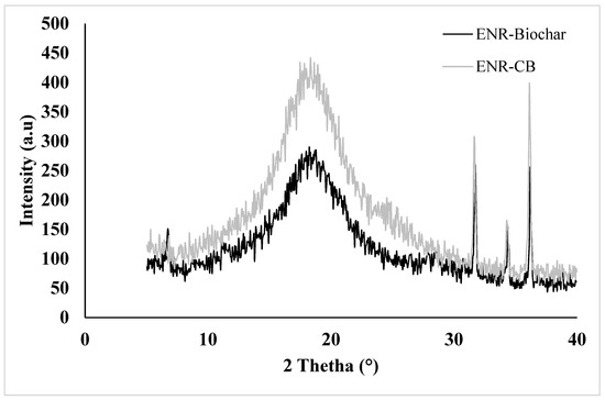 XRD patterns of ENR-Biochar and ENR-CB at 10 phr loading.