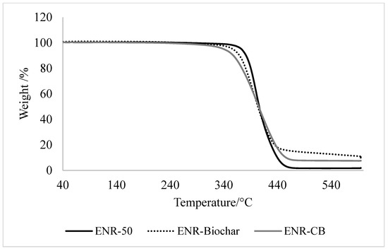 In Figure 8, the weight loss versus temperature graph for ENR and ENR filled vulcanizates are presented and the thermal decomposition of ENR composites. At 600 °C, it can be observed that the gum ENR-50 had the lowest final weight. All of the composites were thermally degraded in a single step. The temperature at which biochar begins to decompose is 340 °C, while the temperature at which the greatest weight loss rate occurs is 390 °C. From the data obtained, ENR-Biochar possessed high thermal stability as it did not fully decompose upon heating up from 40–600 °C, resulting in a higher residue, proportional to the percentage of biocarbon. The remaining solid residue of biochar after heating to 600 °C was 9.8, whereas carbon black was 7.7%. This confirms that, in terms of the thermal degradation mechanism, carbon black and biochar have a similar action on the ENR rubber, and biochar composites exhibited better thermal stability.