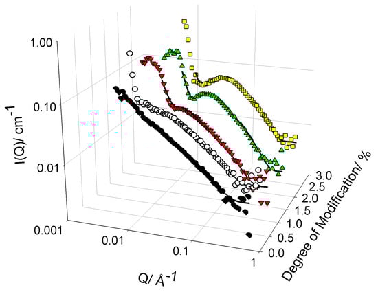 Figure 2 presents the SANS profiles for the family of cat-HEC PEs in aqueous (DO) solutions at a fixed concentration of 1 wt%. As has been previously reported for similar PEs in the semidilute regime, weak scattering is observed for all cat-HEC polymers in this study [15,16,17,18,25], being consistent with the presence of thin, rodlike solution structures. Despite this similarity in scattering intensity, some differences are observed in the shape of the scattering profiles as the degree of side chain modification is increased.