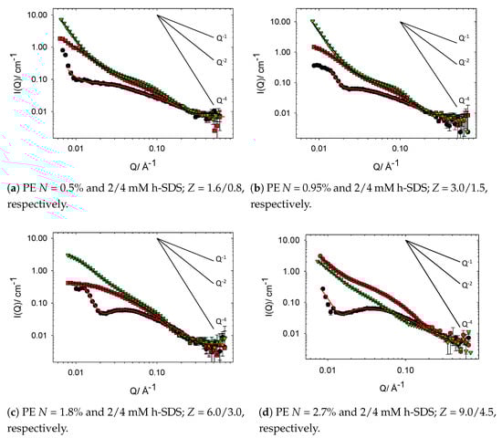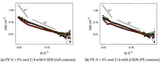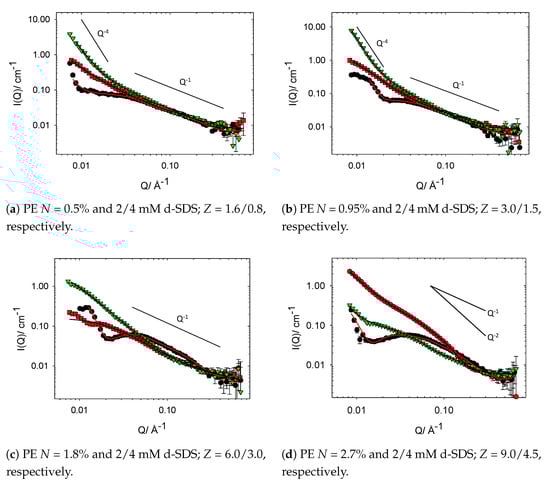 Consider now the data for the mixture containing cat-HEC PE with N = 2.7% and 4 mM SDS. For the 2/4 mM samples in Figure 4d, i.e., the full contrast samples, the overall shapes of the scattering profiles remain grossly similar, with the only notable difference occurring within the mid Q region, whereby the emergence of a weak S(Q) is observed in the 2 mM SDS containing sample. The emergence of this weak S(Q) feature occurs as a result of repulsions within the PE chain as discussed above and seen in the PE-only scattering, and loss of this S(Q) therefore reflects a reduction in repulsive interactions within the PE. Loss of the weak S(Q) occurs as the [] is increased (Z reduced) and, hence, excess PE charges are able to be neutralised. Interestingly, when comparing the full and PE contrast for the N = 2.7% and 4 mM SDS mixtures, a change in Q dependency within the mid Q region is observed. In the full contrast, the mid Q region displays an extended Q dependency; this is reduced to Q in the PE contrast, consistent with scattering from planar surfaces and thin rods, respectively [26,29].