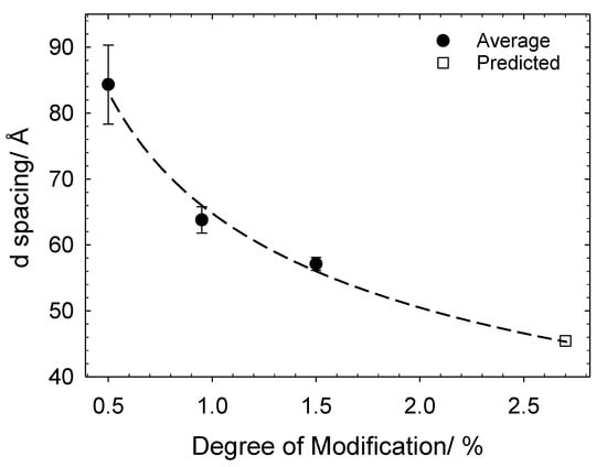 For samples with low Z values, the emergence of weak interference peaks can be seen, representing a repeating unit comprised of bound aggregated surfactant molecules. The emergence of these interference peaks are masked in the PE contrast samples, indicating that they occur as a result of the surfactant. The spacing between these repeating units (d) can be estimated using Q and d = 2/Q, as shown in Figure 5. It was not possible to obtain Q peaks for samples with N = 2.7%; hence, Q peaks were averaged from both the 2 and 4 mM SDS samples (N = 0.5, 0.95, 1.8%) and modelling allowed for a prediction for N = 2.7%. The molecular weight of the family of PEs are expected to remain consistent and, hence, with increasing degree of modification, the charges along the PE backbone will become closer together; Figure 5 therefore displays the reduction in spacing between the surfactant aggregates with increasing degree of charge modification.