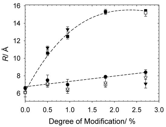 Figure 6 demonstrates a clear increase in the radius of the cat-HEC/SDS complexes as the degree of polymer charge modification is modulated. The steepest increase in radius is observed between 0–1% degree of modification; these mixtures are close to charge neutralisation and no significant repulsion between the positive charges along the polymer backbone are expected. For cat-HEC PEs with a degree of modification above 1%, the radius of the complexes remains relatively stable around 15 Å; these complexes have an overall excess in the [] and hence, larger Z values. Larger Z values indicate that the PE in these complexes will have an excess of positively charged groups along the PE backbone, which can cause additional repulsion and growth within the PE structure. This charge-repulsion-driven growth behaviour is also displayed in the polymer-only data set in Figure 6, whereby the radius of the cat-HEC polymer units increases with degree of modification. It is interesting to note the significant influence that changing the degree of charge modification has on the size of the complexes when compared with altering the [SDS], further indicating the possibility of gaining additional control over the size and related bulk properties of these complexes at fixed concentrations by adjustments to the degree of charge modification.