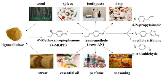 Anethole (AN) is widely used as a masking agent in commodities, such as soap, toothpaste, mouthwash, and cosmetics (Figure 1) [13]. It is also used as an additive and spice in food like candy, baked goods, chewing gum, cigarettes, beverages, and Chinese butter hotpot seasoning [14]. Trans-anethole (trans-AN) is also an important raw material for the synthesis of drugs, which has a certain therapeutic effect on leukopenia caused by chemotherapy or radiotherapy and other reasons [15]. In addition, AN plays a significant role in natural preservatives due to its remarkable ability to inhibit the growth of pathogens [16]. Further more, AN has also been reported to be used for preparing polymer materials by modifying its allyl and methoxy groups [17]. China’s imports and exports of unground star anise in 2020 are about 58 million dollars in total, as released by the General Administration of Customs of China. Anise, star anise, and fennel spices are used as sweeteners or for mouth fresheners, while only trans-AN is considered food grade. Therefore, a stereoselective catalyst is needed to maximize the proportion of trans-AN.