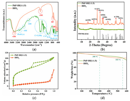 (a) FT-IR spectra; (b) XRD patterns; (c) N2 adsorption-desorption isotherms; (d) TG curves of PhP-Hf (1:1.5) and HfO2.