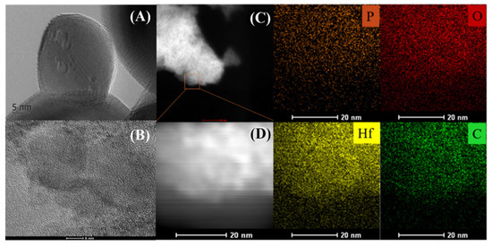Nano-sized materials and structures of catalysts were examined by HR-TEM (Figure 3), showing amorphous structure. This result is in agreement with the crystal structure measured by XRD (Figure 2b). The worm-like stripes shown in Figure 3A can be a result of the disordered interlayers [42]. The particle size is estimated to be ca. 14 nm, indicating the nanostructure of PhP-Hf (1:1.5). The STEM-HAADF diagrams and the elemental mappings in Figure 3 show that P, O, Hf, and C elements are uniformly dispersed on the surface of the catalyst PhP-Hf (1:1.5), which is well connected to the entire nano-hybrid material. This also further proves that the catalyst preparation is successful.