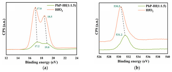 XPS spectra of (a) Hf 4f and (b) O1 s in PhP-Hf (1:1.5) and HfO2.