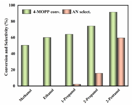 Compared with using H2 as a hydrogen source in the autoclave, the advantage of transfer hydrogenation is that the reaction is relatively safer under milder pressures. At the same time, the equipment requirements are not high, and the hydrogen source used is cheap and easy to obtain. Hereby, we screened the hydrogen supply sources, including methanol, ethanol, 1-propanol, 2-propanol, and 2-pentanol, which were also used as solvents to provide hydrogen protons under optimal reaction conditions (Figure 6). Although other alcohols can also impart hydride for the reduction of 4-MOPP, the obtained AN selectivity is not comparable to that of 2-pentanol. The choice of solvent is that secondary alcohols are based on the fact that secondary alcohols are more effective than primary alcohols in the CTH reaction. Gratifyingly, 2-pentanol proved to be the best hydrogen donor, which can be ascribed to its relatively lower reduction potential (67.9 kJ mol−1) and high boiling point (118–119 °C).