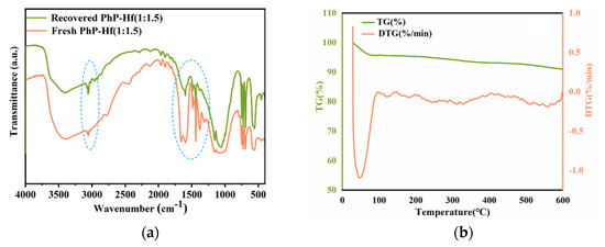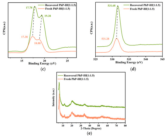 To test the change of catalyst structure before and after the reaction, PhP-Hf (1:1.5) recovered after reusing five cycles was characterized by FT-IR (Figure 10a), TG-DTG (Figure 10b), XRD (Figure 10c), and XPS (Figure 10d,e). Figure 10a shows that the catalyst can still maintain its complete structure after being recycled five times. Figure 10b shows that the recovered catalyst has a small amount of loss after 100 °C, while the fresh one starts to lose after 300 °C, indicating that the recycling has a certain impact on the thermal stability. Figure 10c shows the binding energy of Hf 4f increased from (17.38 and 18.88 eV) to (17.78 and 19.38 eV) in recovered PhP-Hf (1:1.5), indicating that the electron cloud density around O decreased, and the corresponding Lewis acidity increased. For Figure 10d, the binding energy of the recovered PhP-Hf (1:1.5) (531.68 eV) is relatively higher than that of the fresh PhP-Hf (1:1.5) (531.28 eV), possibly because of the smaller negative charge on the oxygen species with a lower base strength. It can be seen from Figure 10e illustrates that there is almost no change in crystal form after repeated use. Overall, these figures all prove that there is almost no change after reusing the catalyst, which is a good way to reduce waste and conform to the concept of environmentally friendly chemistry. Therefore, PhP-Hf (1:1.5) can be used as a green bifunctional catalyst for promoting CTH coupled with other cascade reactions.