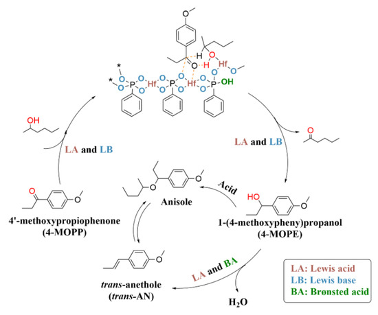 A possible reaction mechanism was explored (Scheme 2). First, 4-MOPP and 2-pentanol undergo MPV reduction with the catalyst. In this process, a typical six-member transition state is formed. The Lewis acidity of Hf4+ helps to increase the activity of the carbonyl group. Through transfer hydrogenation, the carbonyl group on the raw material is converted to a hydroxyl group, forming 4-MOPE, while the 2-pentanol is converted to 2-pentanone. 4-MOPE is further dehydrated under the action of Brønsted and Lewis acids to form trans-AN. The main by-product in this reaction is ether, also known as anisole, which is formed by the etherification of the secondary alcohol with 4-MOPE in the presence of the acid catalyst [44]. With the extension of reaction temperature and time, the ether could also be converted to the final product trans-AN by the removal of 2-pentanol.