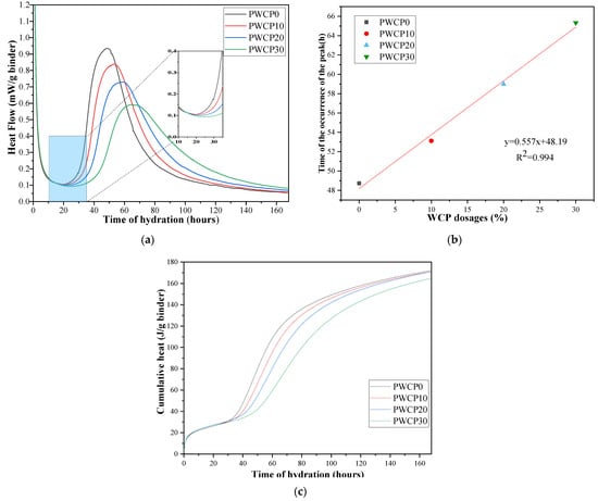 2. The results of the heat of hydration analysis show that as the WCP content increased, the cumulative heat of hydration over 72 h decreased. This is because the WCP reaction rate is slower in the early stages. The cumulative heat of hydration for 168 h was almost the same, which shows that WCP participated in the reaction.