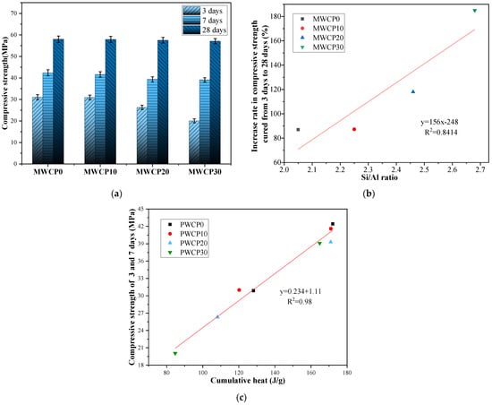 Figure 6c shows the relationship between the cumulative heat and the compressive strength at 3 and 7 days. It was found that there was an obvious linear relationship between the cumulative heat and the compressive strength at 3 and 7 days, and the value of R