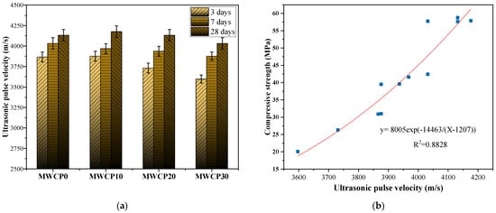 43]. This trend is similar to the results of the compressive strength test, in that the values of UPV and compressive strength both increase with age.