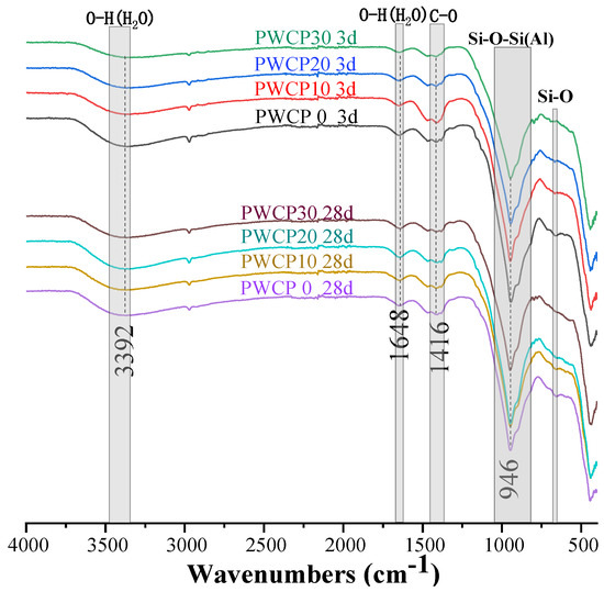 Figure 8 shows the FTIR spectra of all PWCP samples at 3 and 28 days.