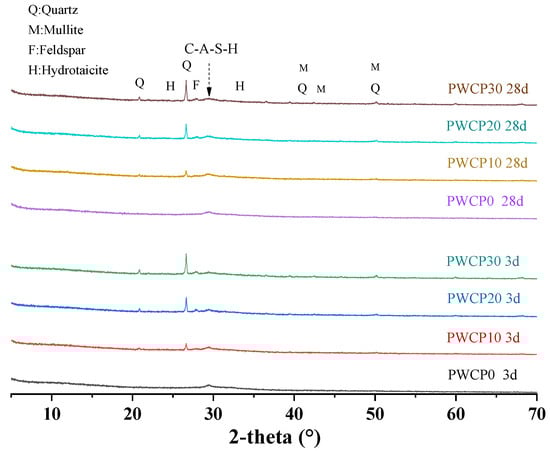 50]. As the WCP content increased, the peak intensity of the hydrotalcite phase decreased. This is because of the shallow penetration of Mg into the WCP, which led to a reduction in the hydrotalcite phase. For the PWCP sample containing WCP, quartz, mullite, and feldspar were detected, and the peak intensity increased with the increase in the WCP content, which was always present owing to the inertness of the quartz reaction. In addition, a hump of CASH was also observed. Since CASH is an amorphous phase, it is difficult to observe changes in the amount of CASH across different samples.