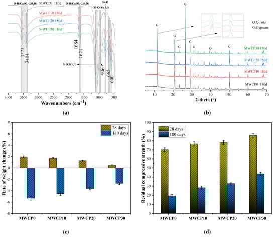 Figure 10a shows the FTIR spectrum of the MWCP samples exposed to 10% sulfuric acid. The absorption peak position clearly proves the presence of gypsum in the MWCP sample attacked by sulfuric acid. The peaks appearing in the range of 3550–3400 cm