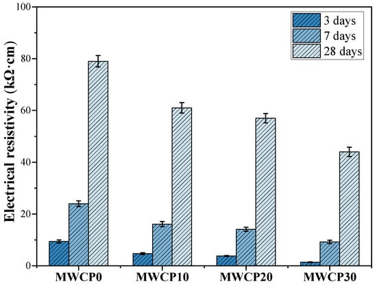 Figure 11 shows the resistivity results of all MWCP samples tested by the four-electrode Wenner method after curing for 3, 7, and 28 days. This study found that with an increase in age, the resistivity of all the samples increased. As the reaction progressed, the ions in the alkaline solution were consumed. CASH bound more alkali ions, thereby increasing the resistivity [