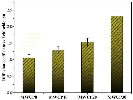 Figure 12 shows the non-steady-state diffusion coefficients of the chloride ions of MWCP calculated from the experimental data. When we tested the depth of penetration of chloride ions in this study, the depth of penetration in different parts of the same sample was also different. Therefore, when processing the experimental data, error bars were added to display the calculated chloride ion diffusion coefficient. The coefficient of variance for the test results for the diffusion coefficient is less than 10%. The largest chloride ion diffusion coefficient was observed in the sample MWCP30. The increase in the chloride diffusion coefficient can be attributed to an increase in the porosity. An increase in the WCP content will affect unreacted and partially reacted particles, resulting in more porous structures [