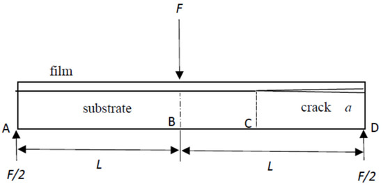 To derive the mode II interfacial fracture toughness of a film/substrate composite structure, a theoretical model based on an end-notched flexure (ENF) specimen with an edge crack along the interface was adopted. The ENF specimen was subjected to a three-point bending loading as shown in Figure 2, where F is the external load applied at the middle point B of the specimen and F/2 is the reaction force at the two supports A and D. The lengths of the edge crack and ENF specimen were a and 2L, respectively.