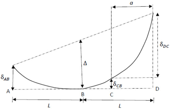 The deformation of the ENF specimen induced by the three-point bending loading is schematically shown in Figure 3. The displacement of point B where the external load is exerted can be written as