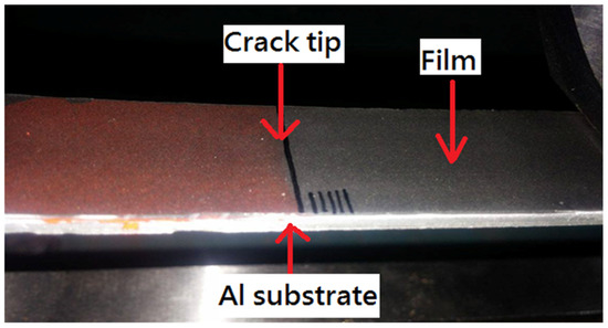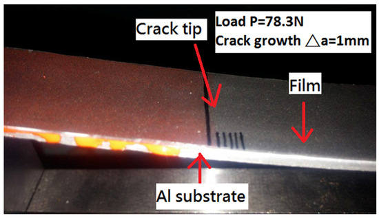 Since GNP-reinforced nanocomposite appears in a black color even at a very small amount of GNP, it is difficult to identify the crack tip. To resolve this problem, red ink was infiltrated into the interfacial crack region, as shown in Figure 6. The contrast in colors makes the detection of crack propagation easier. Figure 7 illustrates the initiation of the crack propagation at the critical load .
