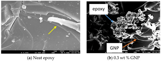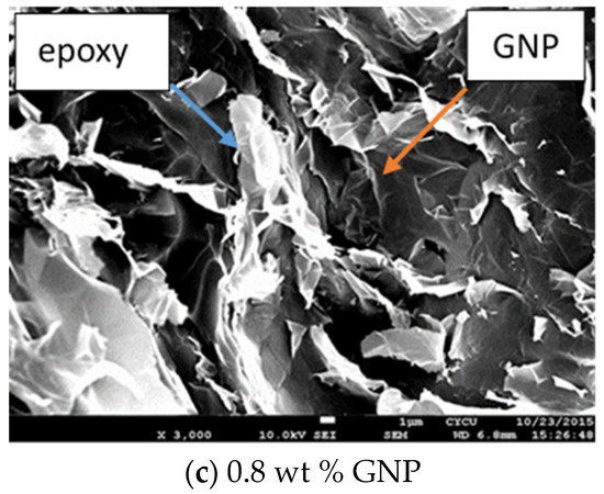 A smooth surface morphology of the neat epoxy as shown in Figure 8a illustrates a brittle fracture behavior with weak resistance to the crack propagation [47]. On the other hand, nanocomposite incorporated with GNPs exhibits a rough surface. It is noted that an increase of the surface roughness is induced by the creation of plastic deformation [48]. As a result, a large fracture energy is dissipated. Furthermore, GNP with a large surface area and strong interfacial adhesion with epoxy matrix can bridge microcracks and prevent the crack propagation. It can be concluded that good dispersion in conjunction with strong adhesion between GNPs and the epoxy matrix leads to an increase of energy dissipation and effectively alters the crack propagation during the fracture process.