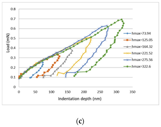 Load vs. indentation depth curves for nanocomposite films. (a) neat epoxy (b) nanocomposite reinforced with 0.3 wt % GNP, (c) nanocomposite reinforced with 0.8 wt % GNP.