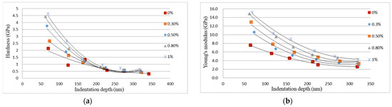 Hardness and Young’s modulus of the nanocomposite films reinforced with different loadings of GNP. (a) Hardness vs. indentation depth (b) Young’s modulus vs. indentation depth.