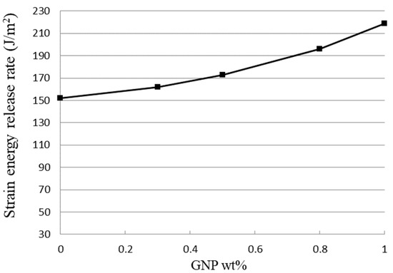 The strain energy release rate is considered as a measurement of the energy required to induce an extension of the crack, which is crucial to evaluate the structural safety. A two-dimensional geometry of GNP has a very large aspect ratio. This feature provides an important mechanism for the fracture resistance referred to as crack bridging [45]. A bridging process of a matrix crack makes the nanocomposite more resistant to the crack propagation. In addition, the waviness and curved shape of GNP hinder the crack propagation and prompt crack deflection, resulting in a higher fracture resistance [46]. Two other important factors contributed to the toughening effect of GNP are (1) good dispersion of GNP in the epoxy matrix and (2) strong interfacial adhesion between the GNP and epoxy. The SEM images shown in Figure 8b,c depict a good dispersion and interaction of GNP in epoxy resin. Wang et al. [32] also reported that GNP can effectively disturb and deflect the crack propagation due to its two-dimensional structure in combination with a large aspect ratio.